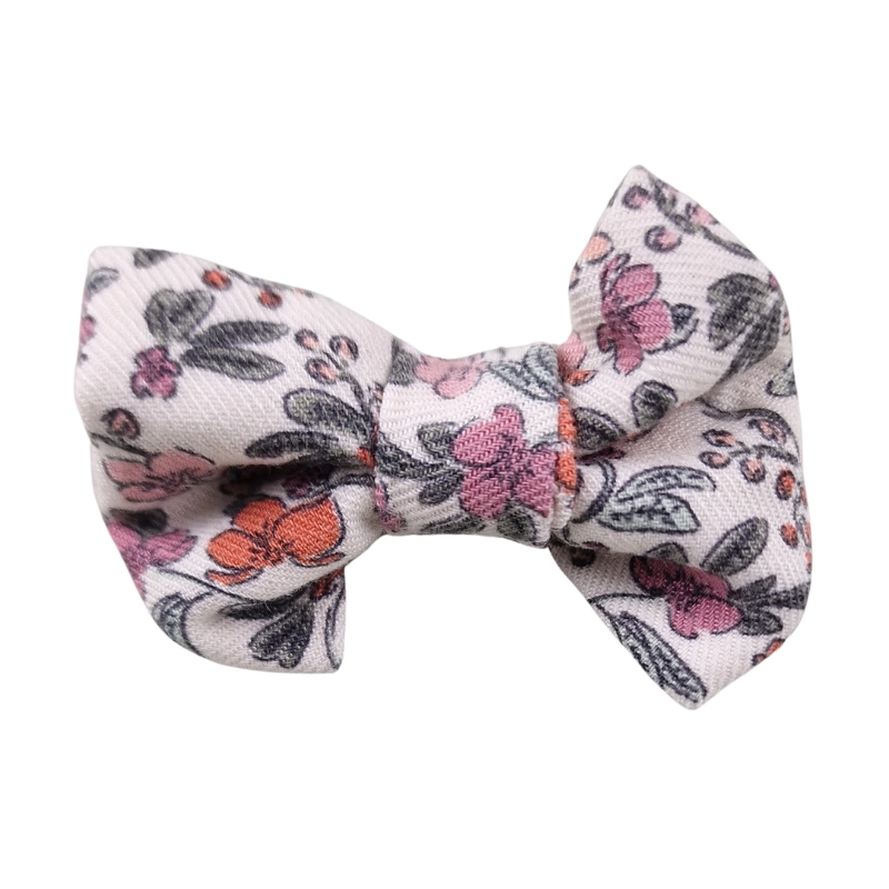 Cette barrette upcyclée a été réalisée à partir d’une robe Vertbaudet soigneusement revalorisée par La Créa’Laeti. Son tissu écru orné de fleurs roses et orangées apporte une touche douce et délicate à la coiffure.