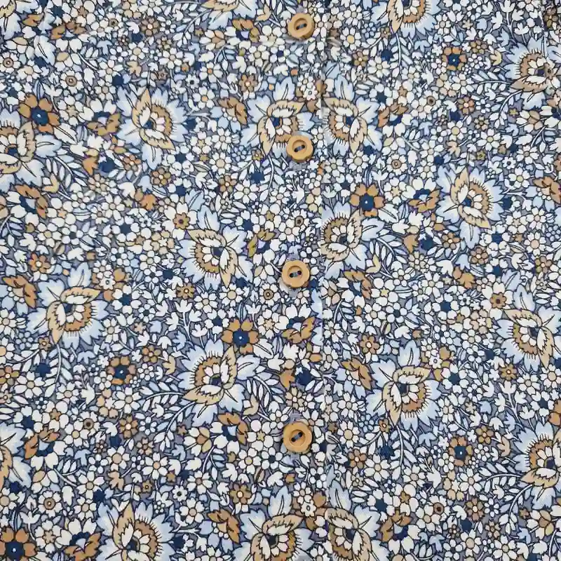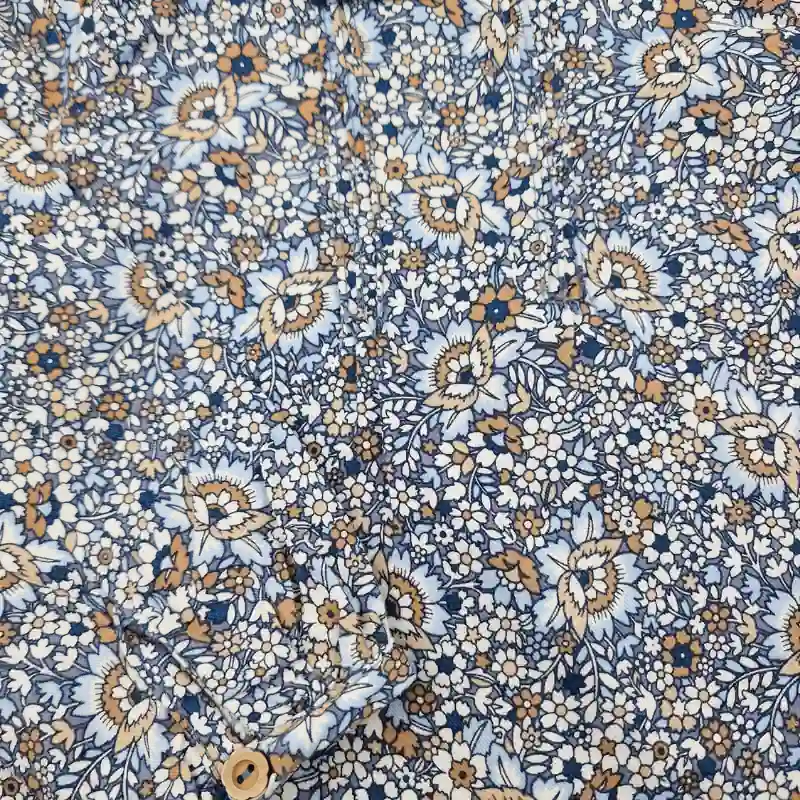 Une blouse Sergent Major en voile de coton léger avec un imprimé fleuri dense mêlant bleu marine, blanc et caramel. Romantique et raffinée, idéale pour les journées de mi-saison.