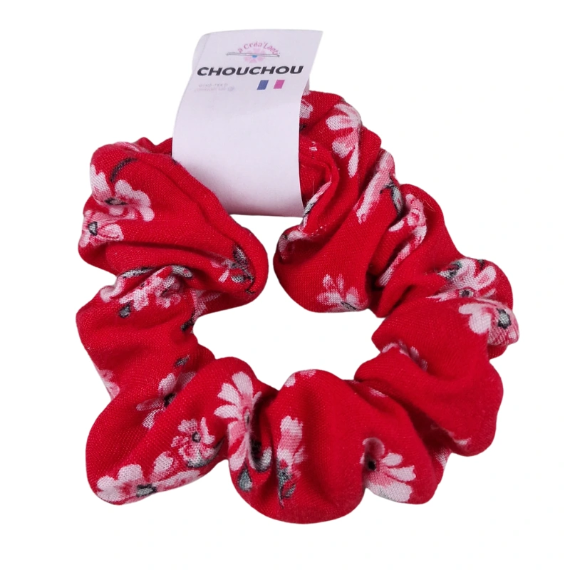 Ce chouchou upcyclé a été réalisé à partir d’une robe soigneusement revalorisée par La Créa’Laeti. Son tissu rouge orné de délicates fleurs blanches apporte une touche vive et pleine de charme aux coiffures.
