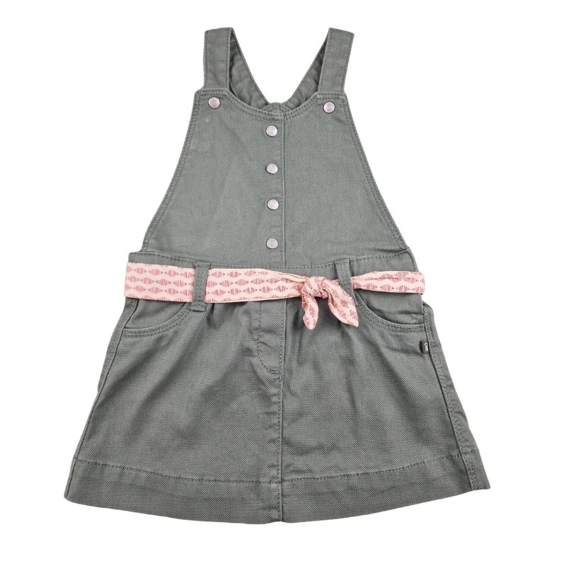 Une jolie robe salopette au style casual, parfaite pour le quotidien. Sa couleur vert doux et sa ceinture rose apportent une touche originale et pleine de charme.