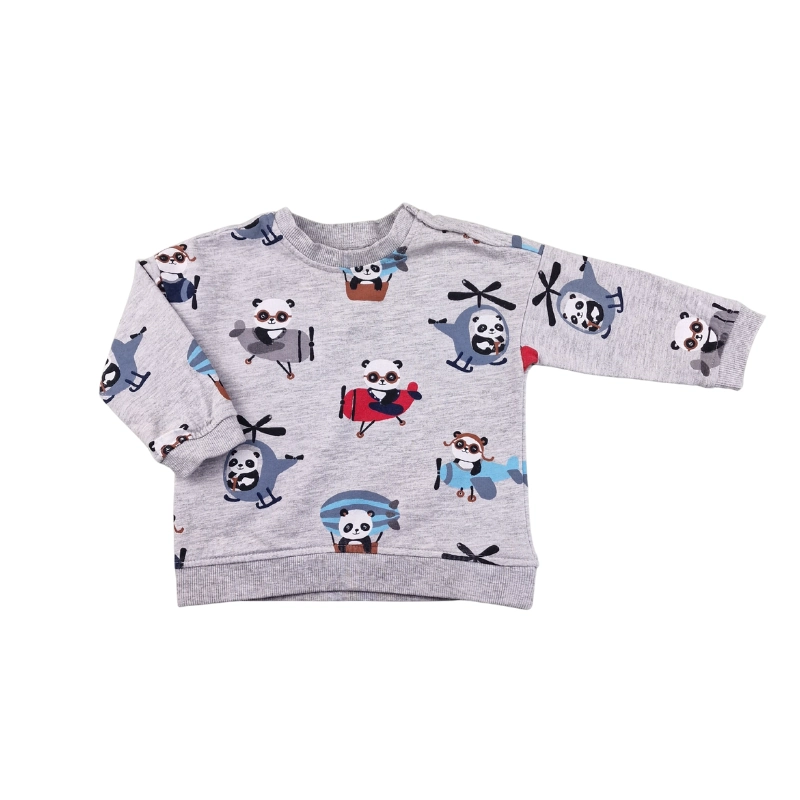 Chaleureux et amusant, ce sweat H&M pour bébé 4/6 mois attire le regard avec son motif panda sur avions, hélicoptères et dirigeables.